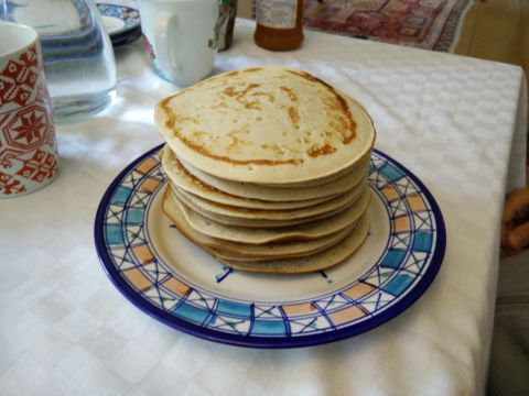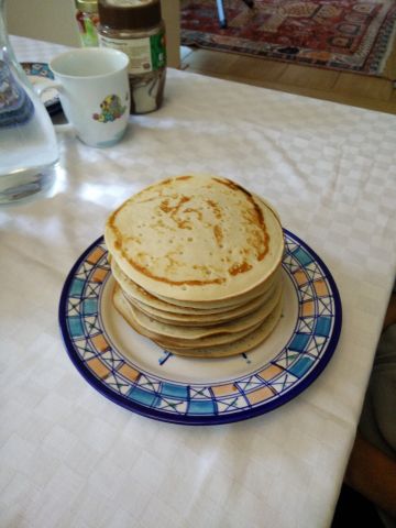 No final deita-se a manteiga derretida e volta-se a mexer muito bem. Agora coloca-se uma frigideira (anti aderente) ao lume até aquecer, a frigideira deve ser de 20 cm ou 18 cm de diâmetro. Agora é só colocar uma pequena porção de massa na frigideira e espalha-la pelo fundo. Quando a massa começar a fazer bolhinhas vira-se a panqueca e deixa-se alourar.