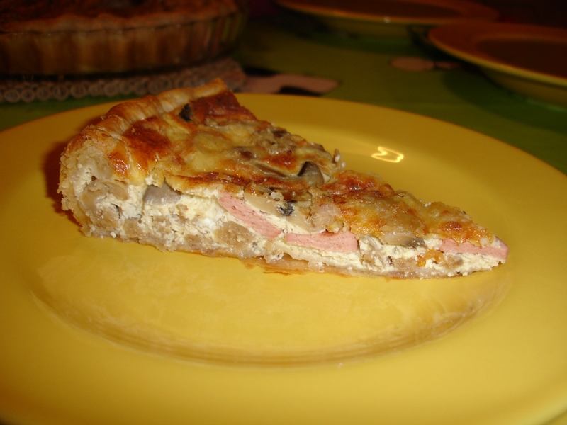 Distribui-se o seitan cortado aos cubinhos pequeninos, os cogumelos e o milho pelo fundo da massa que esteve no forno. Mistura-se os ovos com o bechamel e tempera-se com sal, pimenta, noz-moscada e alho seco moido na altura.